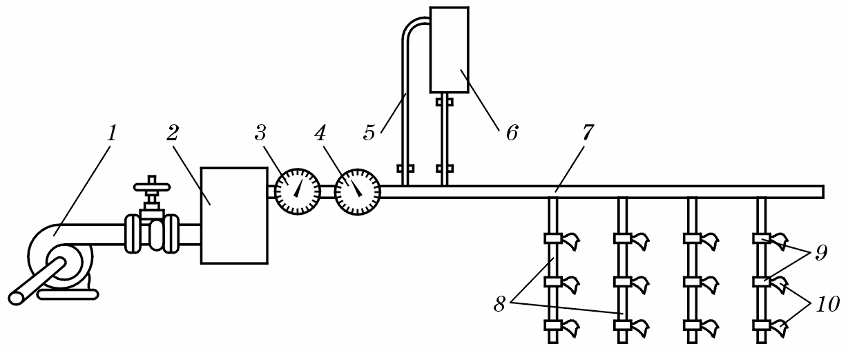 Рис. 13.28. Схема системи крапельного зрошення: 1 — насос; 2 — фільтр очищення води; 3 і 4 — контрольні прилади; 5 — з’єднувальний трубопровід; 6 — гідропідживлювач; 7 — магістральний трубопровід; 8 — розподільний трубопровід; 9 — патрубки; 10 — крапельниці