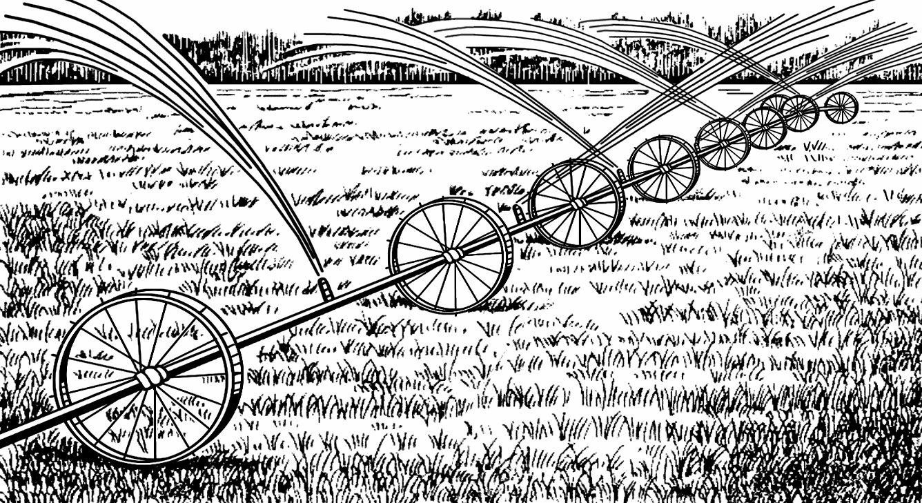Розподіляють воду на полях за допомогою тимчасової зрошувальної системи, що складається з тимчасових зрошувачів, вивідних борозен і поливної