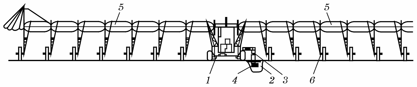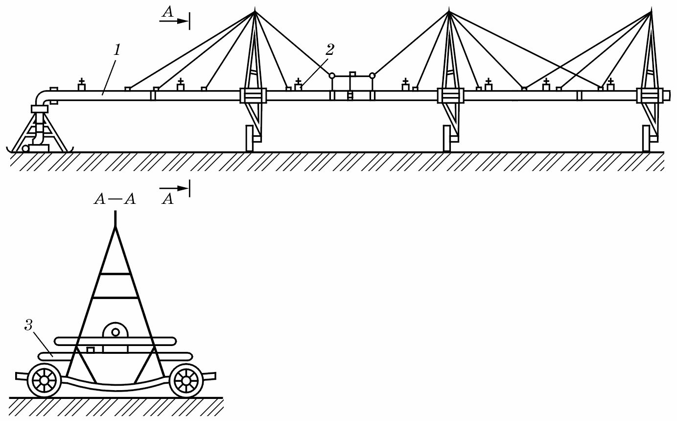 Рис. 13.33. Дощувальна машина «Фрегат»: 1 — водопровідний трубопровід; 2 — дощувальні апарати; 3 — самохідна опора
