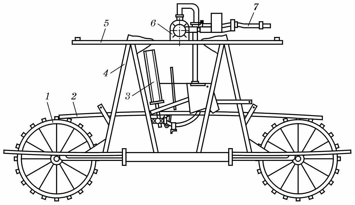 Рис. 13.34. Самохідна опора машини «Фрегат»: 1 —колесо; 2 — система важільного механізму приводу коліс; 3 — гідропривід; 4 — рама; 5 — труба; 6 — система автоматичної синхронізації руху опори; 7 — огорожа
