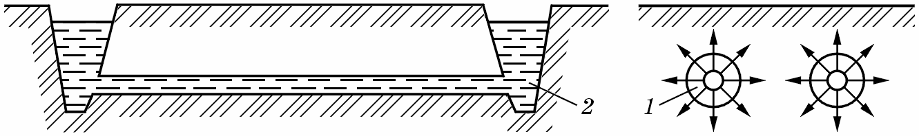 П і д ґ р у н т о в е з р о ш е н н я провадять за рахунок подавання води в активний шар ґрунту до коренів рослин (рис. 13.27) по трубах 1 або кротовинах 2 на глибині 40...50 см. Воно не руйнує структуру ґрунту, не потребує відкритої мережі, дає змогу механізувати обробіток ґрунту та економно витрачати воду.